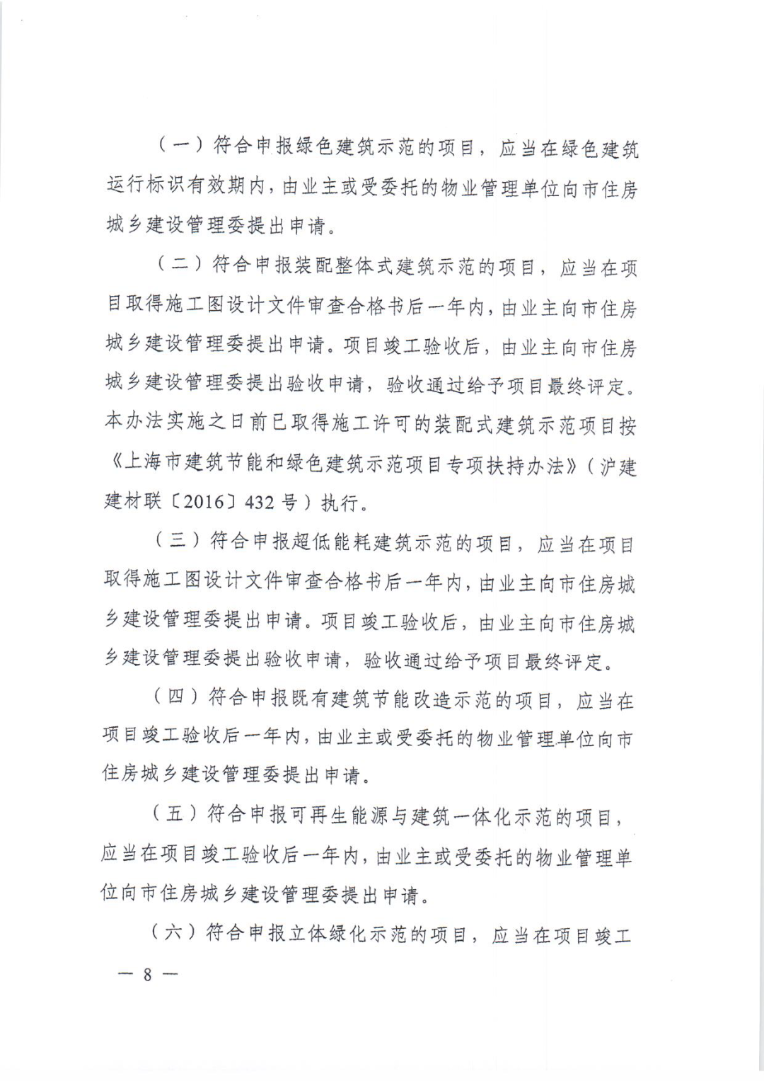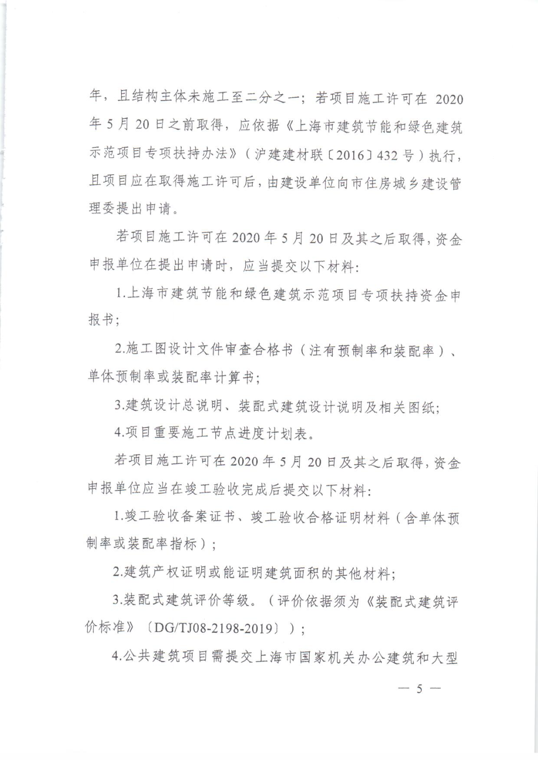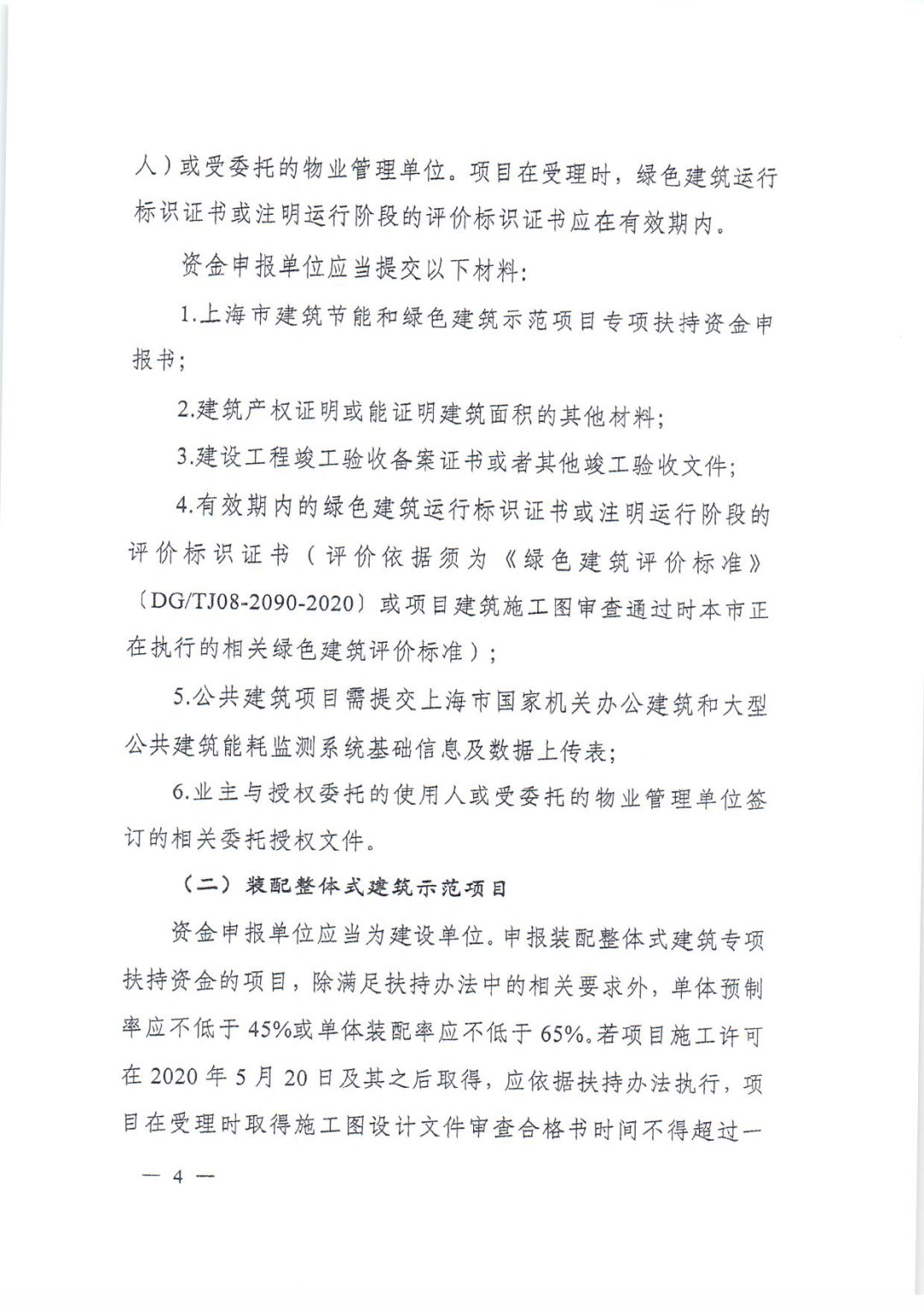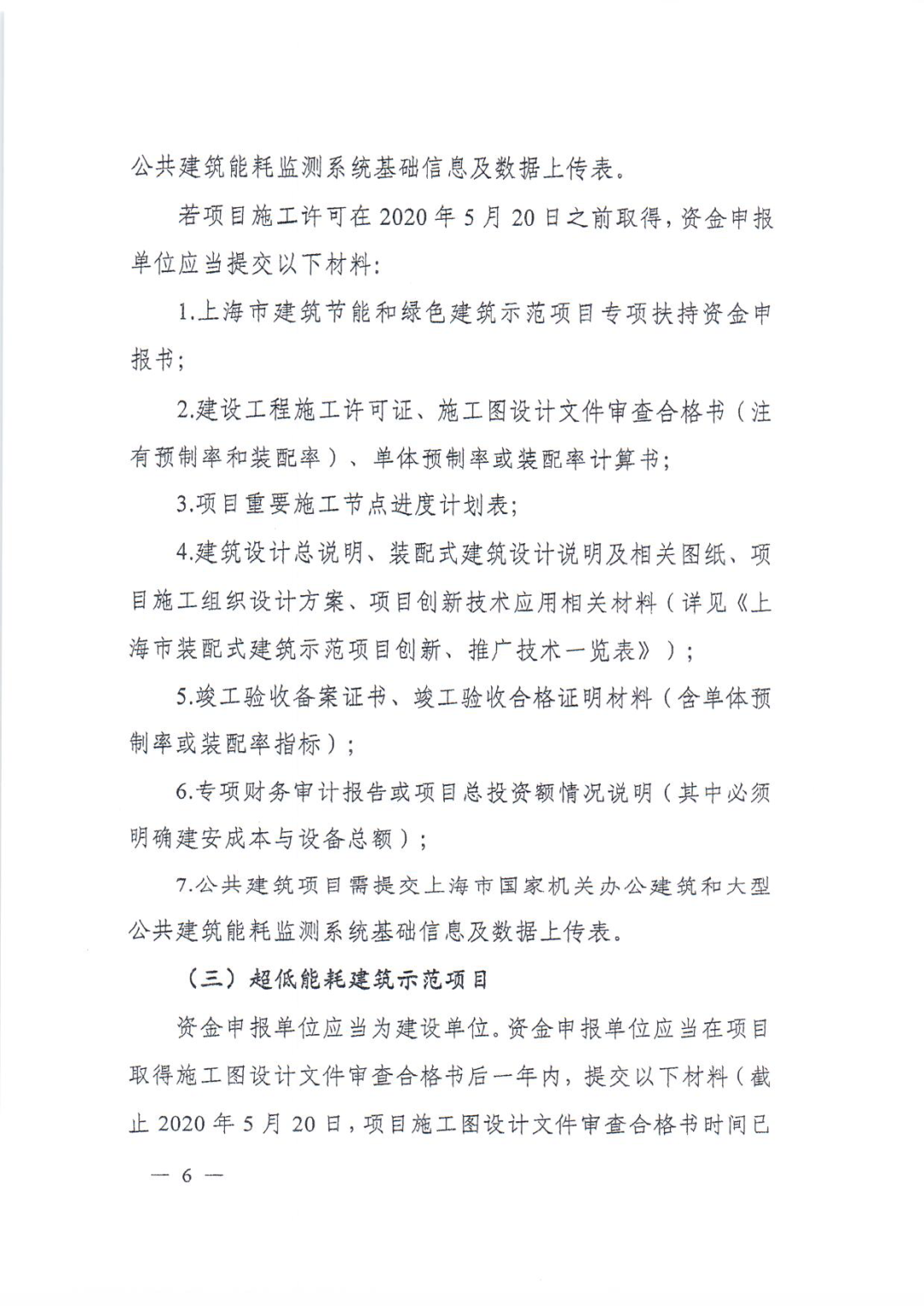 資金申報(bào)單位應(yīng)當(dāng)為建設(shè)單位。申報(bào)裝配整體式建筑專項(xiàng)扶持資金的項(xiàng)目,除滿足扶持辦法中的相關(guān)要求外,單體預(yù)制率應(yīng)不低于45%或單體裝配率應(yīng)不低于65%。若項(xiàng)目施工許可在2020年5月20日及其之后取得,應(yīng)依據(jù)扶持辦法執(zhí)行,項(xiàng)目在受理時(shí)取得施工圖設(shè)計(jì)文件審查合格書(shū)時(shí)間不得超過(guò)一年,且結(jié)構(gòu)主體未施工至二分之一;若項(xiàng)目施工許可在2020年5月20日之前取得,應(yīng)依據(jù)《上海市建筑節(jié)能和綠色建筑示范項(xiàng)目專項(xiàng)扶持辦法》(滬建建材聯(lián)〔2016〕432號(hào))執(zhí)行, 且項(xiàng)目應(yīng)在取得施工許可后,由建設(shè)單位向市住房城鄉(xiāng)建設(shè)管理委提出申請(qǐng)。若項(xiàng)目施工許可在2020年5月20日及其之后取得,資金申報(bào)單位在提出申請(qǐng)時(shí),應(yīng)當(dāng)提交以下材料:1.上海市建筑節(jié)能和綠色建筑示范項(xiàng)目專項(xiàng)扶持資金申報(bào)書(shū);2.施工圖設(shè)計(jì)文件審查合格書(shū)(注有預(yù)制率和裝配率)、單體預(yù)制率或裝配率計(jì)算書(shū);3.建筑設(shè)計(jì)總說(shuō)明、裝配式建筑設(shè)計(jì)說(shuō)明及相關(guān)圖紙;4.項(xiàng)目重要施工節(jié)點(diǎn)進(jìn)度計(jì)劃表。若項(xiàng)目施工許可在2020年5月20日及其之后取得,資金申報(bào)單位應(yīng)當(dāng)在竣工驗(yàn)收完成后提交以下材料:1.竣工驗(yàn)收備案證書(shū)、竣工驗(yàn)收合格證明材料(含單體預(yù)制率或裝配率指標(biāo));2.建筑產(chǎn)權(quán)證明或能證明建筑面積的其他材料;3.裝配式建筑評(píng)價(jià)等級(jí).(評(píng)價(jià)依據(jù)須為《裝配式建筑評(píng) 價(jià)標(biāo)準(zhǔn)》(DG/TJ08-2198-2019));4.公共建筑項(xiàng)目需提交上海市國(guó)家機(jī)關(guān)辦公建筑和大型公共建筑能耗監(jiān)測(cè)系統(tǒng)基礎(chǔ)信息及數(shù)據(jù)上傳表。若項(xiàng)目施工許可在2020年5月20日之前取得,資金申報(bào)單位應(yīng)當(dāng)提交以下材料:1.上海市建筑節(jié)能和綠色建筑示范項(xiàng)目專項(xiàng)扶持資金申報(bào)書(shū);2.建設(shè)工程施工許可證、施工圖設(shè)計(jì)文件審查合格書(shū)(注有預(yù)制率和裝配率)、單體預(yù)制率或裝配率計(jì)算書(shū);3.項(xiàng)目重要施工節(jié)點(diǎn)進(jìn)度計(jì)劃表;4.建筑設(shè)計(jì)總說(shuō)明、裝配式建筑設(shè)計(jì)說(shuō)明及相關(guān)圖紙、項(xiàng)目施工組織設(shè)計(jì)方案、項(xiàng)目創(chuàng)新技術(shù)應(yīng)用相關(guān)材料(詳見(jiàn)《上 海市裝配式建筑示范項(xiàng)目創(chuàng)新、推廣技術(shù)一覽表》);5. 竣工驗(yàn)收備案證書(shū)、竣工驗(yàn)收合格證明材料(含單體預(yù) 制率或裝配率指標(biāo));6. 專項(xiàng)財(cái)務(wù)審計(jì)報(bào)告或項(xiàng)目總投資額情況說(shuō)明(其中必須 明確建安成本與設(shè)備總額);7. 公共建筑項(xiàng)目需提交上海市國(guó)家機(jī)關(guān)辦公建筑和大型 公共建筑能耗監(jiān)測(cè)系統(tǒng)基礎(chǔ)信息及數(shù)據(jù)上傳表。