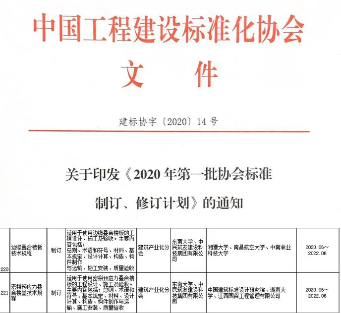 日前,筑友集團(tuán)牽頭申報(bào)的《密拼預(yù)應(yīng)力疊合樓蓋技術(shù)規(guī)程》及《邊緣疊合樓板技術(shù)規(guī)程》兩本中國(guó)工程建設(shè)標(biāo)準(zhǔn)化協(xié)會(huì)(CECS)標(biāo)準(zhǔn)順利獲得立項(xiàng)批準(zhǔn),并列入2020年中國(guó)工程建設(shè)標(biāo)準(zhǔn)化協(xié)會(huì)標(biāo)準(zhǔn)制定計(jì)劃。