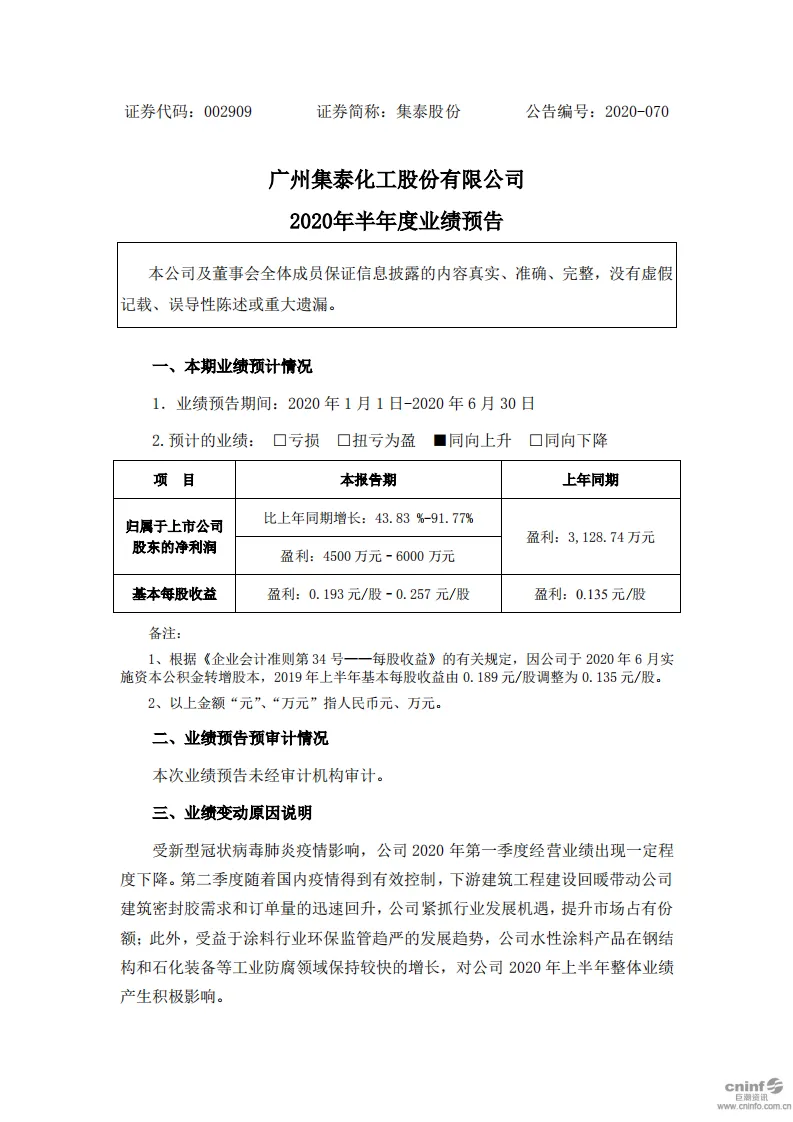 機(jī)構(gòu)近期密集調(diào)研集泰股份。據(jù)調(diào)研,集泰股份上半年的利潤增長受益于地產(chǎn)公司的集采政策。集泰股份旗下品牌安泰建筑膠已經(jīng)連續(xù)6年被評(píng)為500強(qiáng)房地產(chǎn)開發(fā)企業(yè)密封膠類首選供應(yīng)商前3強(qiáng),在行業(yè)內(nèi)處于領(lǐng)先的地位。另外,全國百強(qiáng)房企中目前公司已成功進(jìn)入到92家大型房地產(chǎn)企業(yè)的品牌庫。據(jù)調(diào)研,疫情好轉(zhuǎn)后房地產(chǎn)開工率提升,對(duì)建筑密封膠需求直接提高。建筑密封膠市場頭部效應(yīng)加劇、品牌集中度提升,頭部企業(yè)市場占有率提升,所以訂單量也相對(duì)應(yīng)提高。目前集泰股份產(chǎn)能可以覆蓋全部訂單需求。國內(nèi)生產(chǎn)密封膠的企業(yè)眾多,行業(yè)集中度較低,但在2018年原材料價(jià)格高漲、房地產(chǎn)行業(yè)調(diào)控以及今年新冠疫情影響等多種因素的作用下,密封膠行業(yè)的洗牌加速,頭部效應(yīng)愈加明顯,低端產(chǎn)品逐步被淘汰,中高端產(chǎn)品需求明顯,公司緊抓市場機(jī)遇搶占市場份額。房地產(chǎn)集采興起,集泰發(fā)揮品牌效應(yīng)